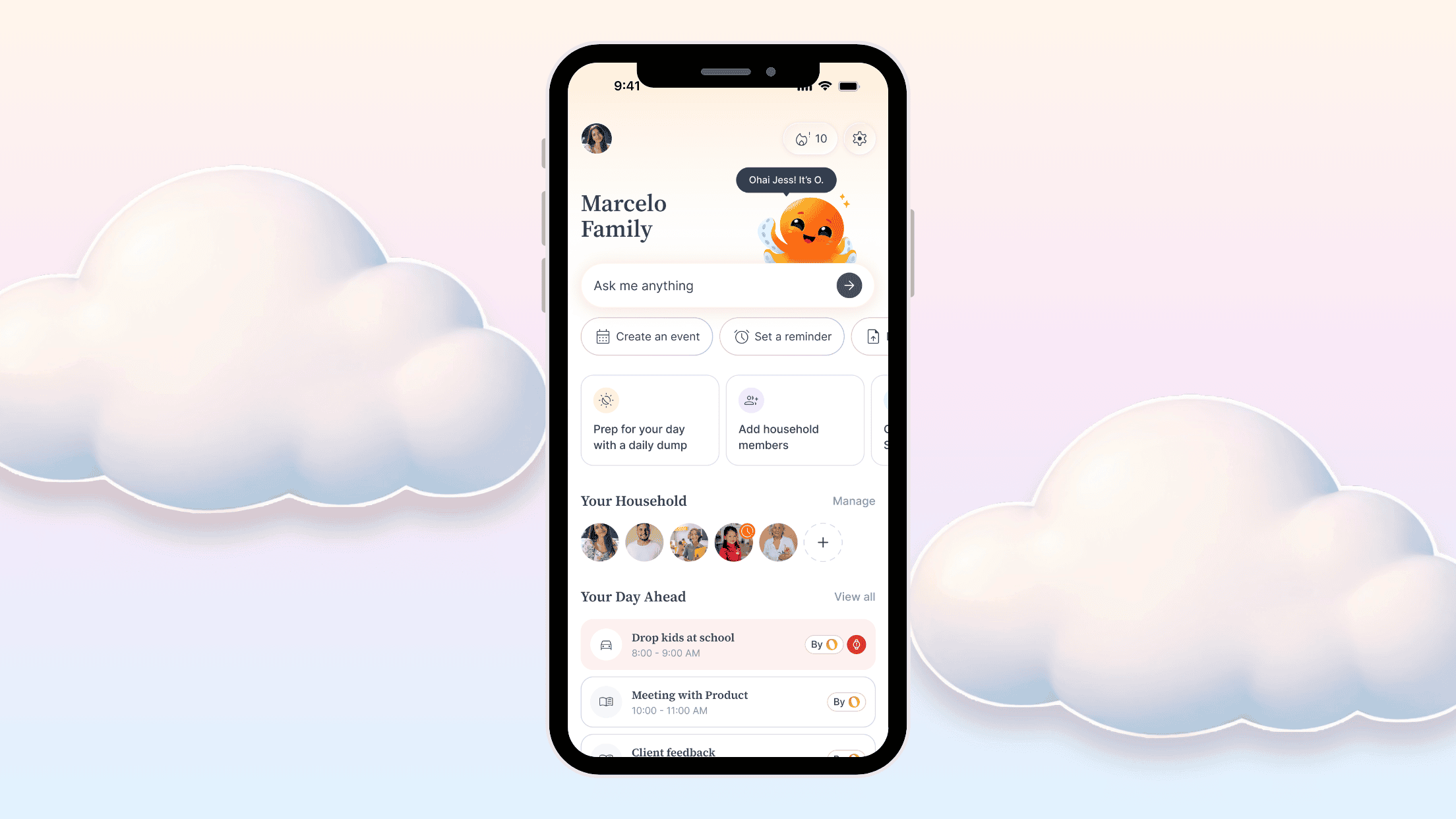 At a glance you'll see your upcoming events, today's to-dos, active reminders, and your household members. There are quick shortcuts to the features you use most, and O is right there ready to help whenever you need it.